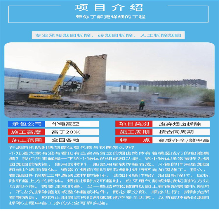 鹽城蘇弘高空工程有限公司承接煙囪防腐、煙囪維修、煙囪刷航標、煙囪美化、煙囪加固、煙囪刷色環(huán)等各種煙囪拆除相關(guān)業(yè)務(wù),歡迎來電咨詢!